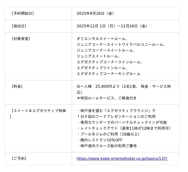 神戸メリケンパークオリエンタルホテル(所在地:兵庫県神戸市中央区)は、2025年9月26日(金)より、華やかなクリスマスシーズンに向けて、ワンランク上の客室カテゴリー「エグゼクティブルーム」