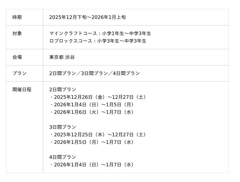子ども向けプログラミング教育事業の株式会社CA Tech Kids(読み:シーエーテックキッズ、本社:東京都渋谷区、代表取締役社長:上野朝大)は、プログラミング体験ワークショップ「Tech Kids CAMP Winter 2025」を、2025年12月下旬から開催いたします。