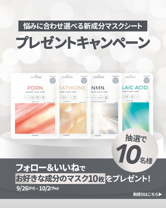 ・商品名:CENQUR エッセンシャルセラムマスク(グルタチオン/アゼライン酸/NMN/PDRN)・発売日:2025年10月2日(木)より順次発売