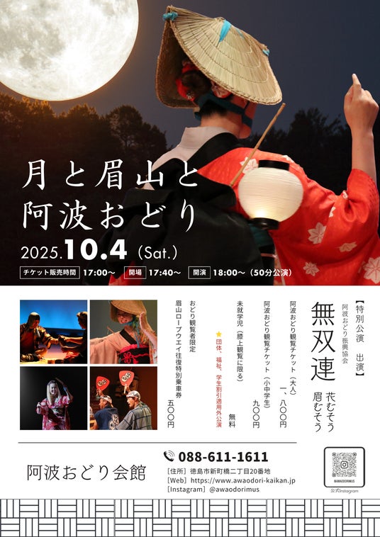 秋の夜長に、日本百名月にも選ばれた「眉山から望む月」と阿波おどりを楽しんでいただくため、中秋の名月に合わせて、「阿波おどり」と「お月見」を融合させたイベントを開催します。