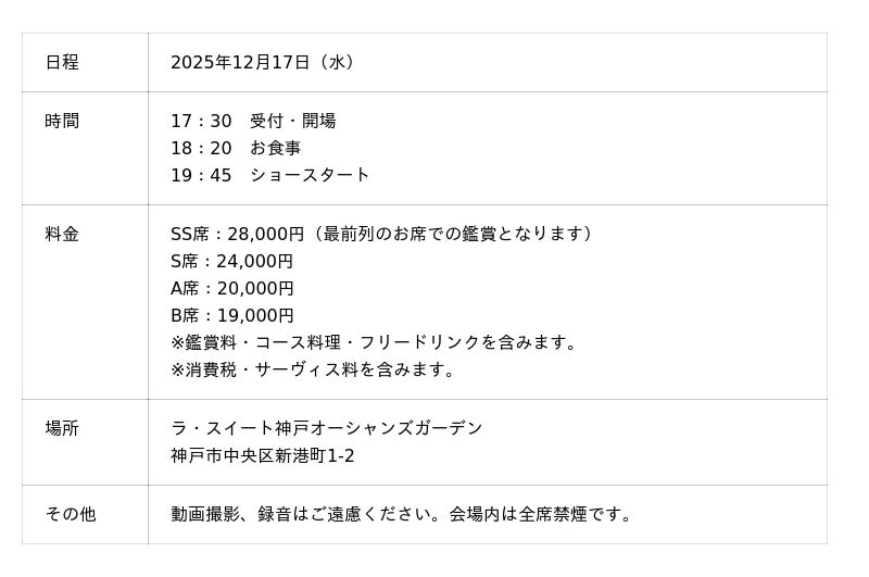 また、当日は神戸マイスターで同館総料理長の中村実によるお食事もご用意。ディナーをフリードリンクと共にお愉しみいただけます。2025年のペナントレースの余韻も愉しむ、特別な夜をお過ごしください。