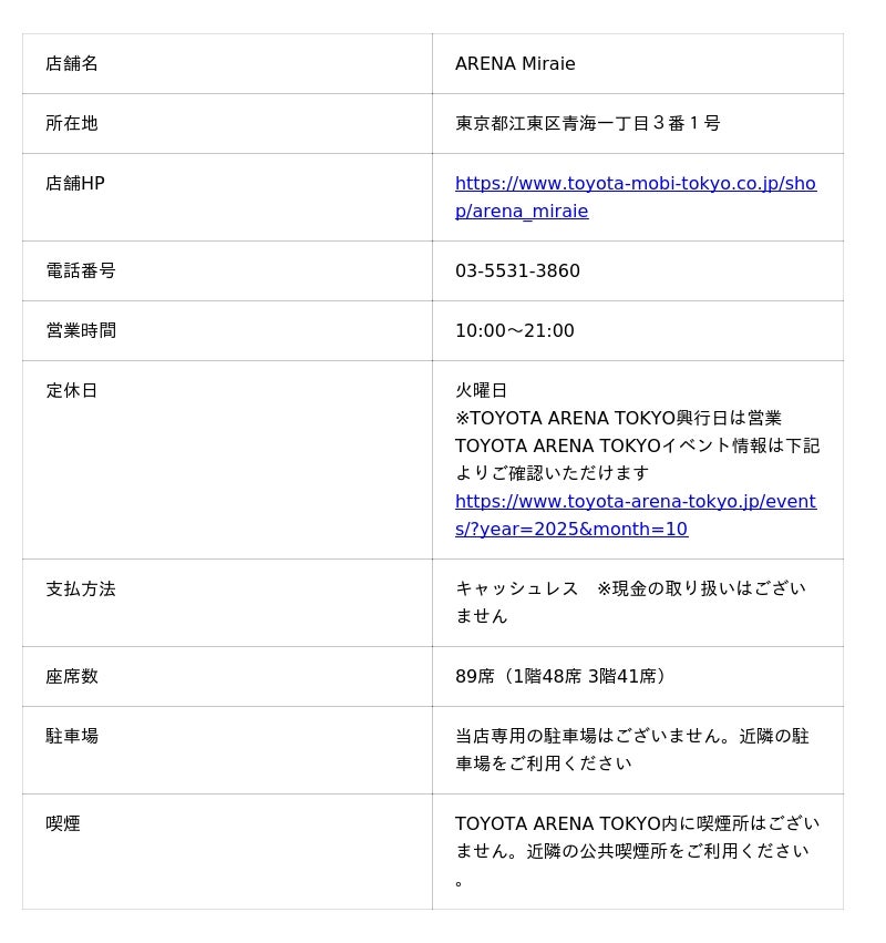トヨタアルバルク東京株式会社(本社:東京都江東区、代表取締役社長:林 邦彦)は、2025年10月3日(金)開業の新アリーナ「TOYOTA ARENA TOKYO」の敷地内に、トヨタモビリティ東京株式会社(社長 佐藤 康彦)が運営するスポーツカフェ&バー「ARENA Miraie」がアリーナの開業日と同日の10月3日(金)にオープンすることをお知らせします。