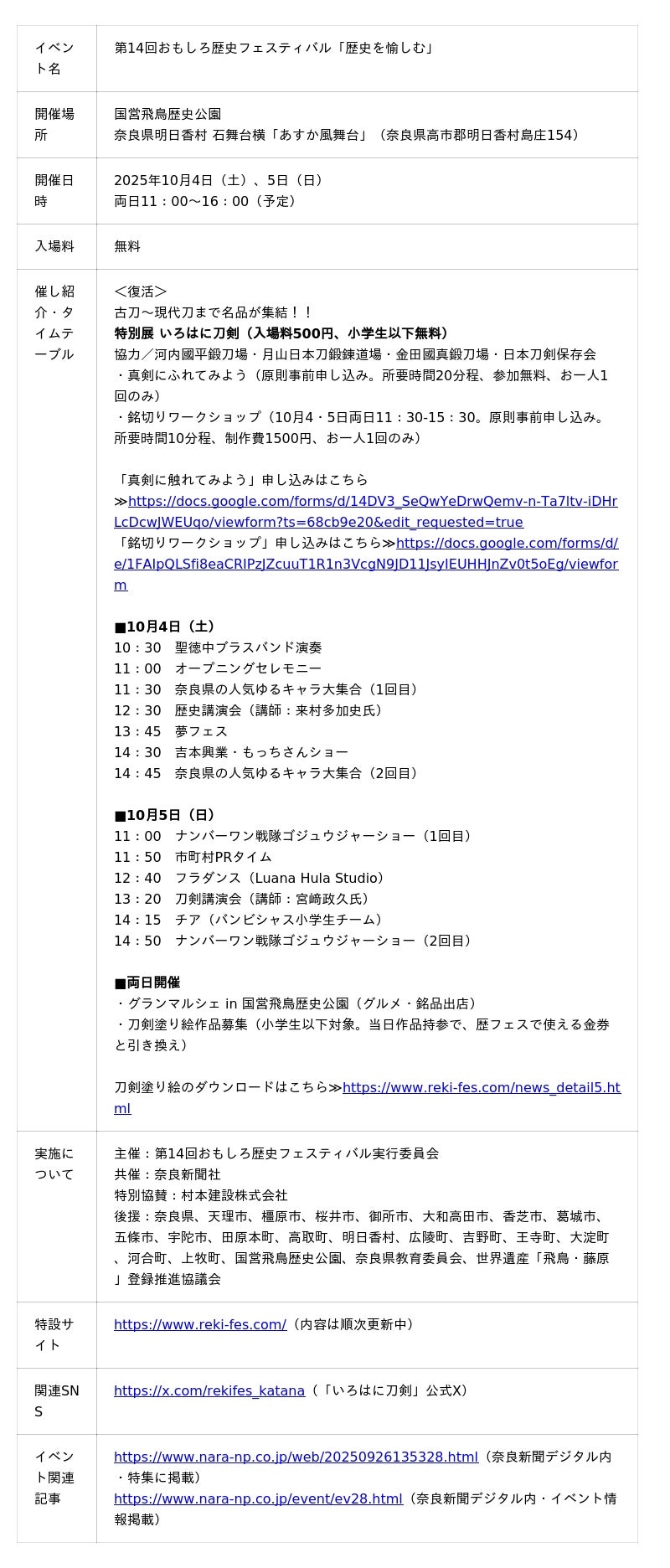 【人気の刀剣展示や体験も復活!】第14回おもしろ歴史フェスティバル「歴史を愉しむ」/10月4・5日の2日間、奈良県明日香村の「国営飛鳥歴史公園」に集まろう!