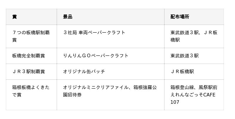 スタンプラリーの景品は、達成状況に応じて、4種類に分かれており、鉄道各社のオリジナルグッズや板橋区オリジナルグッズ等をご用意。