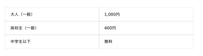 入場料(税込):一般大人1,200円、一般高校生600円、中学生以下無料