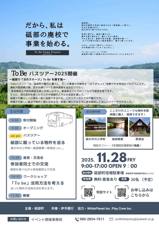 株式会社伊予銀行(頭取 三好 賢治)は、砥部町(町長 古谷 崇洋)とともに、企業誘致や関係人口創出による地域活性化を目的とした「To Be バスツアー2025」を開催しますので、下記のとおりお知らせいたします。