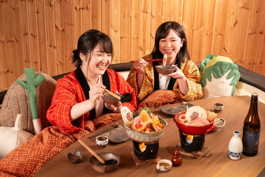 土鍋の形をした鍋こたつが新登場します。白菜や長ねぎなどをモチーフにしたクッションに囲まれれば、まるで自分が大鍋の具材になったかのような、ユニークな写真撮影や体験が楽しめます。湯気立つ鍋料理を囲みながら、足元からじんわり温まる、青森屋ならではの冬の限定体験です。