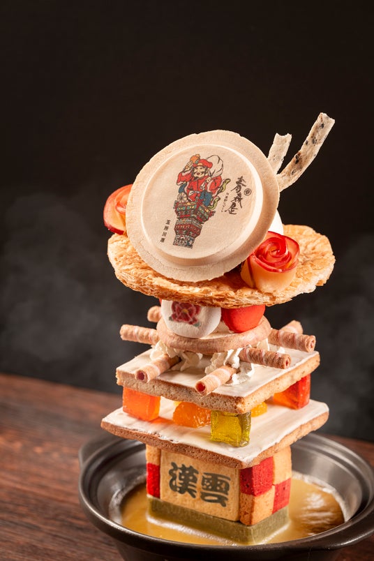 高さ約23mにもなる立佞武多の迫力を、高さ約23cmのパフェで表現し、スケール感を楽しめるデザート鍋です。中には、サクサクとした軽やかな食感とやさしい甘さが特徴の「ほしもち」や、香ばしいゴボウスティックが入っています。温かいカスタードソースにディップすれば、とろける甘さと香ばしさも楽しめます。