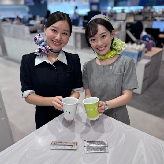 株式会社AIRDO(本社:北海道札幌市 代表取締役社長:鈴木 貴博) と株式会社ソラシドエア (本社:宮崎県宮崎市 代表取締役社長:山岐 真作) は、共同持株会社「リージョナルプラスウイングス」の設立3周年を記念し、2025年10月1日(水)から両社の機内販売およびオンラインショップにおいて、「AIRDO×ソラシドエア 機内サービス風おもてなしペアカップ」の販売を開始します。