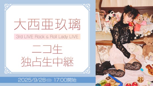2025年9月28日開催の『大西亜玖璃 3rd LIVE Rock&Roll Lady LIVE』公演をニコニコ生放送にて配信が決定。視聴チケットはドワチケサイトより販売中。