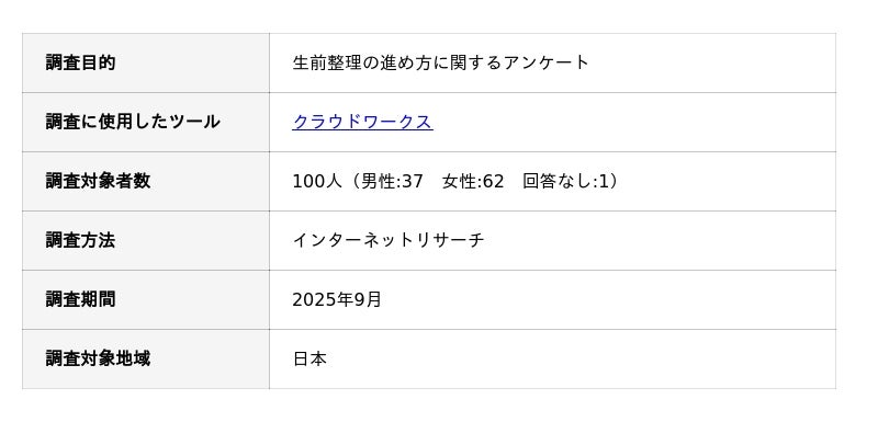 おうちにプロでは、ハウスクリーニングでお悩みの方により有益な情報を提供するために、「生前整理の進め方に関する独自調査」を実施しました。アンケート調査の概要は以下の通りです。