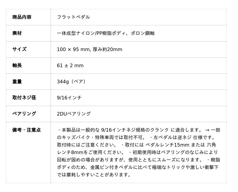 このフラット樹脂ペダルは、耐久性と軽量性を両立したエントリーユーザー向けペダルです。