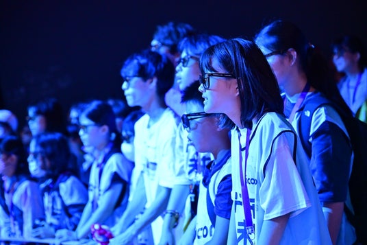子どもたちは3D眼鏡をかけて、目の前のビジョンに映し出される「Perfume」の特別ライブ映像から、未来のコミュニケーションの可能性を学びました。