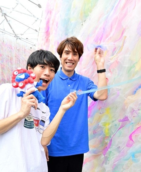 パビリオン内での体験を終え外に出ると、クイズ大会でも出題された、パビリオンの中にいる体験者が笑顔になることでリアルタイムに幕が揺れる様子を目の当たりにしました。今まさに会場内の盛り上がりが空間伝送され、不規則に揺れるのを見て、感情をまとうパビリオンの仕掛けを楽しんでいました。その後、パビリオンを彩るカラフルな布を壁に結びつけ、須貝さんと東さんとの記念撮影をして今回のプログラムが終了。子どもたちからは、「トーク&クイズ大会で事前にNTTパビリオンに関する技術について解説してもらえたことで、実際にNTTパビリオンを体験して、より感動することができました」との感想もあり、これからの通信の未来やコミュニケーションの可能性、そして将来の自分自身について考えるきっかけとなる貴重な体験となりました。