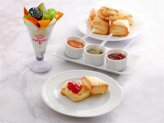 イベントでは、特別にカットされたフルーツを使って、自分だけのパフェを盛付け、お召し上がりいただけます。そのほか「明治屋」のジャムとともにいただくスコーンもご用意しています。