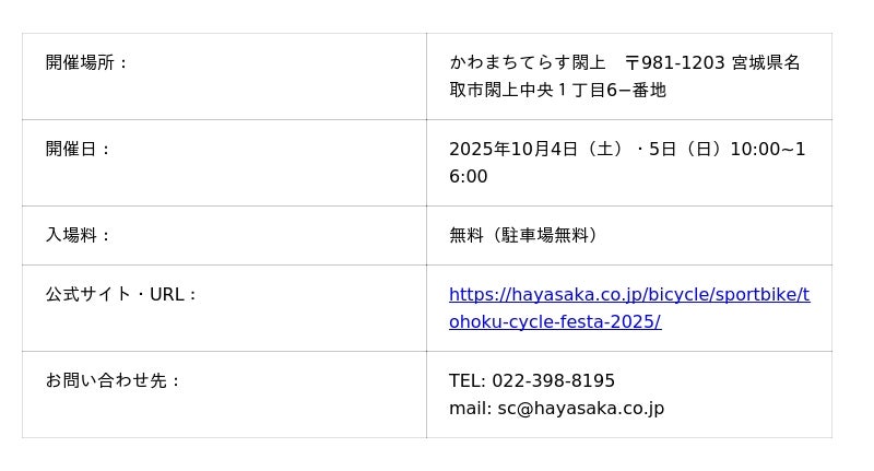 自転車・オートバイを販売および修理する「ハヤサカサイクル」を運営する株式会社早坂サイクル商会(本社:宮城県仙台市、代表取締役:早坂 武)は東北最大級のスポーツサイクルフェスティバル"東北サイクルフェスタ2025 in かわまちてらす閖上"を、今年も10月4日(土)・5日(日)名取市閖上地区のかわまちてらす閖上(ゆりあげ)にて開催する。