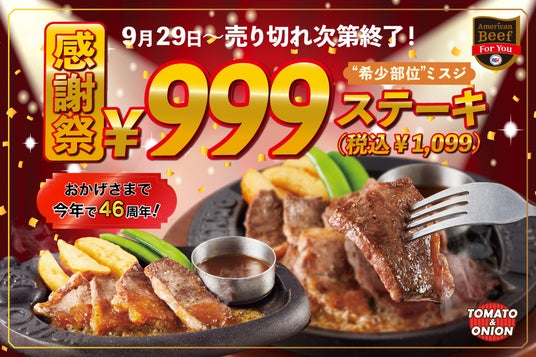 株式会社トマトアンドアソシエイツ(本社:兵庫県西宮市、代表取締役社長:笹村 啓介)が運営するアメリカンダイニングレストラン「トマト&オニオン」では、2025年9月29日(月)より、トマト&オニオン感謝祭の第一弾として"希少部位"ミスジカットステーキを999円(税込1,099円)より、数量限定で販売いたします。