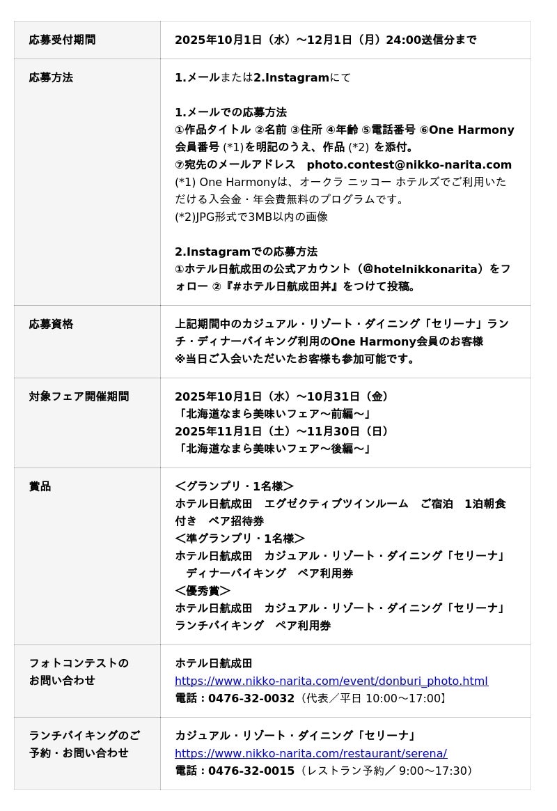 ホテル日航成田(所在地:千葉県成田市、総支配人 山田 篤)では、2025年10月1日(水)から11月30日(日)までの2カ月間、カジュアル・リゾート・ダイニング「セリーナ」にて「北海道なまら美味いフェア」に合わせた『映え丼フォトコンテスト』を開催します。フェアの「丼コーナー」で作った自慢の"マイ丼"の写真をご応募いただくと、入賞者にはホテル日航成田の各種利用券をプレゼントします。