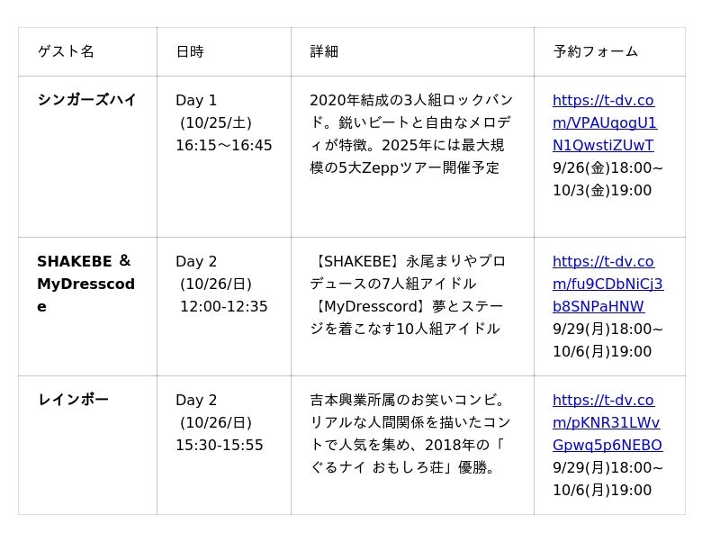 - 迫力のプロステージ×学生の挑戦スペシャルゲスト「シンガーズハイ」がDay1,「SHAKEBE & MyDresscode」がDay2に出演。人気バンド・アイドルグループと学生ステージを一度に楽しめる特別な2日間。来場者は、プロの迫力あるパフォーマンスと、未来のアーティストを目指す学生たちの挑戦を同じ会場で体感できます。
