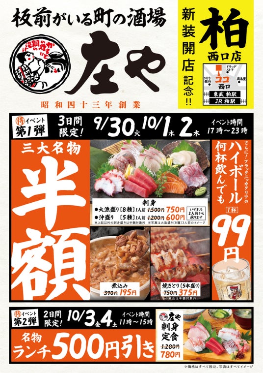 株式会社大庄(東京都大田区/代表取締役社長:平 了壽)は、千葉県柏市の板前がいる町の酒場『庄や』柏西口店を全面改装し、リニューアルオープンします。これを記念し、第一弾として、2025年9月30日(火)~10月2日(木)の夜限定で「刺身盛り合わせ」「煮込み」「焼きとり」の三大名物"半額"イベントを実施。第二弾では10月3日(金)~4日(土)の2日間、昼限定で「庄や刺身定食(通常1280円・税込)」を500円引きの780円(税込)で提供します。