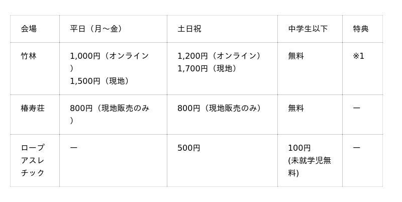 高校生以上 500円 小学生~中学生 100円 未就学児無料(保護者同伴必須)