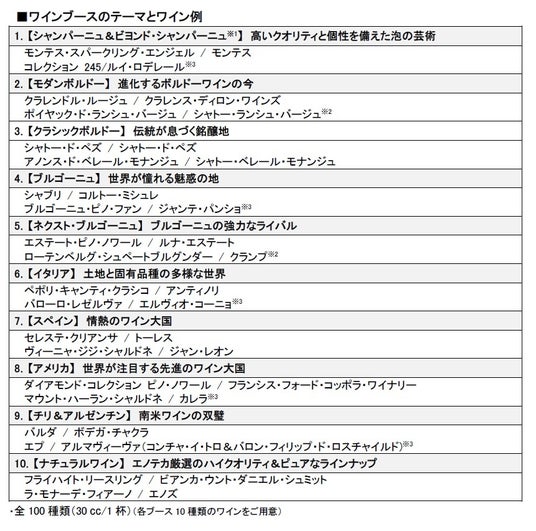 本イベントは、ワイン初心者から愛好家まで幅広い層のお客さまを対象に、100種類のワインからお気に入りの一本に出会う体験型ワインイベントです。会場には地域・国・タイプ別に分かれた10のブースを設置し、チケット制でお好きなワインをお楽しみいただけます。