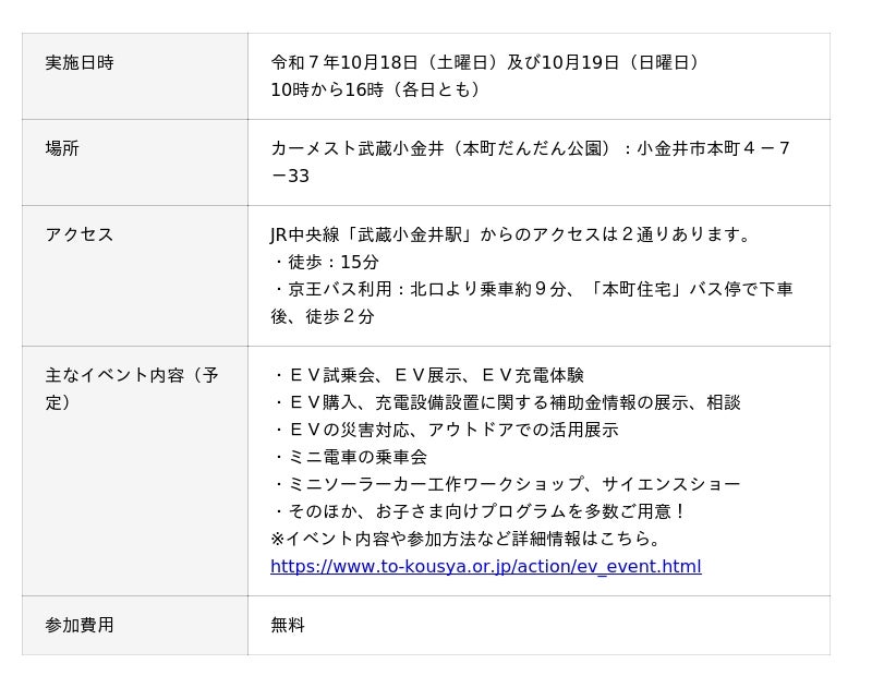 【2025EVをもっと身近に!】大人も子どもも楽しめる体験型イベントを小金井市本町で10/18(土)・19(日)に開催