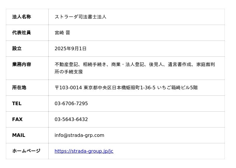 ストラーダグループ法人としてストラーダ司法書士法人(本社:東京都中央区日本橋)を、2025年9月1日(月)より、新たに設立。公式ウェブサイトを公開いたしました。