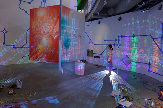 中野裕介/パラモデル《水底の□や△、犬畜生たちの、あったかもしれないPの話》2025 「小湊鉄道開業100周年記念展 古往今来・発車オーライ!」展示風景(市原湖畔美術館/千葉) photo : 木奥恵三 (C)Yusuke Nakano / PARAMODEL 2025 Courtesy of MORI YU GALLERY