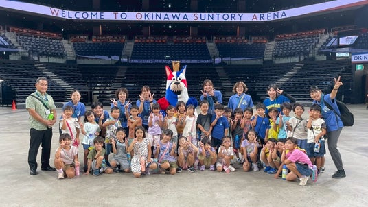 「おおきなわ」の活動の一環として、9月は宜野湾市、うるま市、豊見城市、読谷村から多くの子どもたちと職員の皆さまにご参加いただき、沖縄サントリーアリーナの見学を実施いたしました。