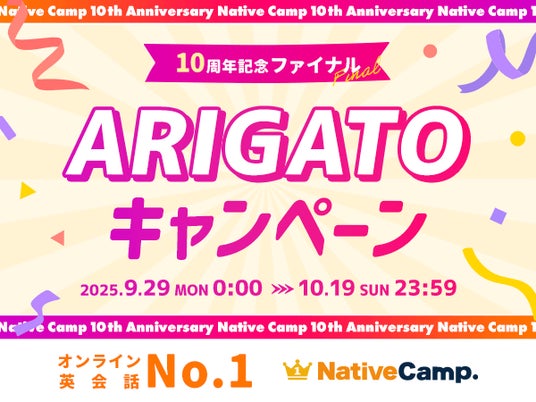 ネイティブスピーカーと回数無制限のオンライン英会話サービス「ネイティブキャンプ英会話」を展開する株式会社ネイティブキャンプ(東京都渋谷区 代表取締役:谷川国洋)は、皆さまに支えられ、この度サービス開始10周年を迎えることができました。これまでのご愛顧に感謝の気持ちを込めて、10周年記念ファイナル企画として「ARIGATOキャンペーン」を開催いたします。