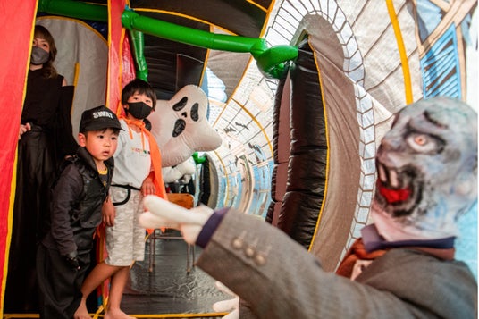 お化け屋敷やふわふわ等のアトラクション(一部有料)が広場を彩り、子どもから大人まで一日中楽しめる空間を展開。