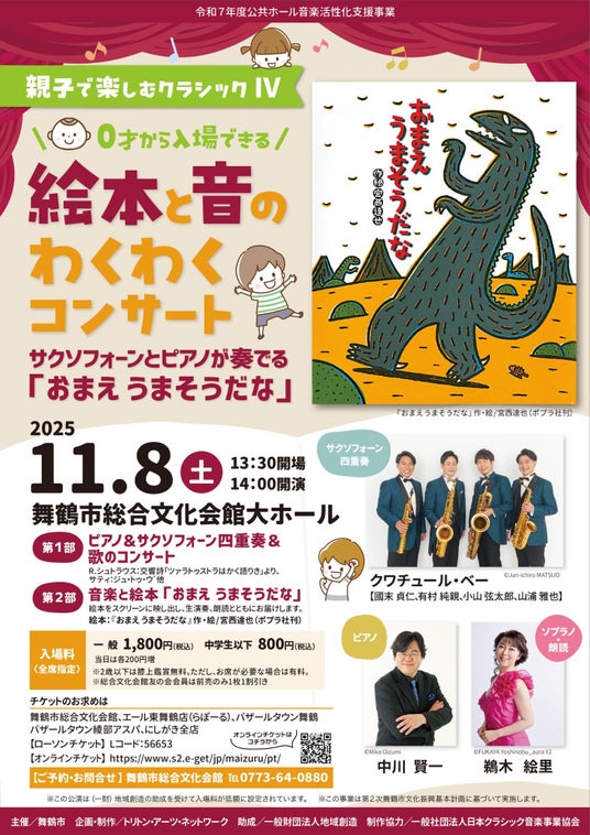 舞鶴市は、令和7年11月8日(土)に舞鶴市総合文化会館で、0才から入場可能なコンサートを開催します。スクリーンに映る絵本と朗読を、ピアノとサックス四重奏の生演奏とともにお届けします。