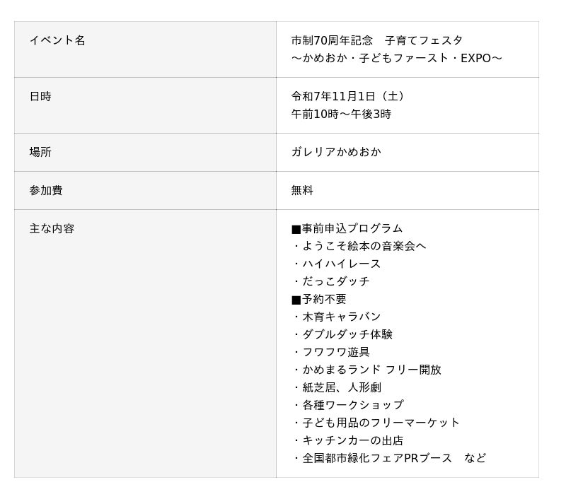 京都府亀岡市(市長:桂川孝裕)は、「市制70周年記念 子育てフェスタ ~かめおか・子どもファースト・EXPO~」を令和7年11月1日(土)にガレリアかめおかで開催します。