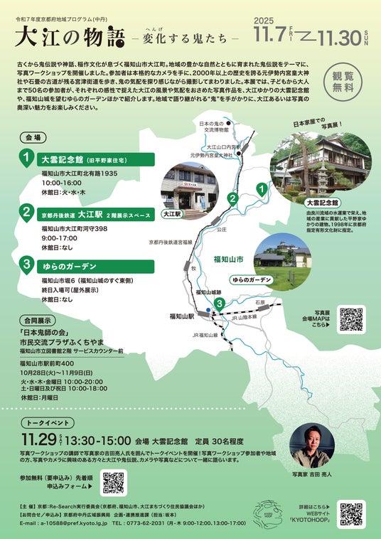 ■京都:Re-Search実行委員会(事務局:京都府)では、8~9月に開催した写真ワークショップの参加者が大江町を巡り、撮影した作品を11月7日から福知山市各所で展示するとともに、11月29日にトークイベントを開催します。