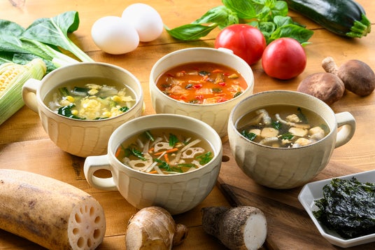 原材料名:【国産野菜とたまごのスープ】塩こうじ、デキストリン、食塩、チキンエキス、乳糖、でん粉、椎茸エキス、還元水飴、酵母エキス、醤油、砂糖、香辛料、具(小松菜(国産)、玉ねぎ、鶏卵、キャベツ、とうもろこし)/酸化防止剤(V.E)、(一部に小麦・卵・乳成分・大豆・鶏肉を含む) 【しょうがと根菜のスープ】醤油、デキストリン、でん粉、魚介エキス、かつおだし、生姜ペースト、食塩、酵母エキス、砂糖、ポークエキス、昆布エキス、具(ごぼう(国産)、水煮れんこん、水菜、生姜、乾燥人参)/酸化防止剤(V.E)、(一部に小麦・大豆・豚肉を含む) 【ミネストローネ】トマトペースト(ポルトガル製造)、食塩、チーズパウダー、砂糖、バター、ポークエキス調味料、野菜だし、チキンエキス調味料、酵母エキス、チキンエキス、オリーブ油、おろしにんにく、野菜エキス、香辛料、具(オニオンソテー、赤ピーマン、乾燥キャベツ、オートミール、乾燥ズッキーニ、乾燥人参、乾燥バジル)/酸化防止剤(V.E)、香辛料抽出物、(一部に小麦・乳成分・大豆・鶏肉・豚肉・りんごを含む) 【韓国のりスープ】がらスープの素、醤油、魚介エキス(魚介類)、食塩、でん粉、ごま油、砂糖、酵母エキス、発酵調味料、おろしにんにく、生姜ペースト、香辛料、具(豆腐(国内製造)、里芋、玉ねぎ、ほうれん草、味付のり、乾燥椎茸、いりごま、かつお削りぶし)/豆腐用凝固剤、酸化防止剤(V.E)、(一部に小麦・ごま・大豆・鶏肉・豚肉・魚介エキス(魚介類)を含む)