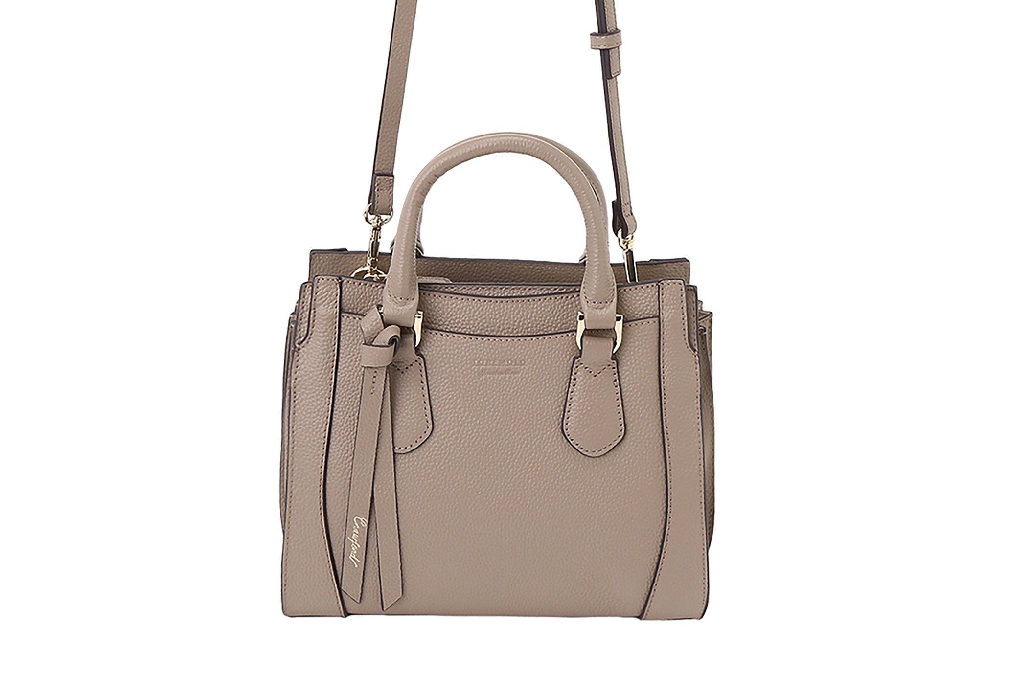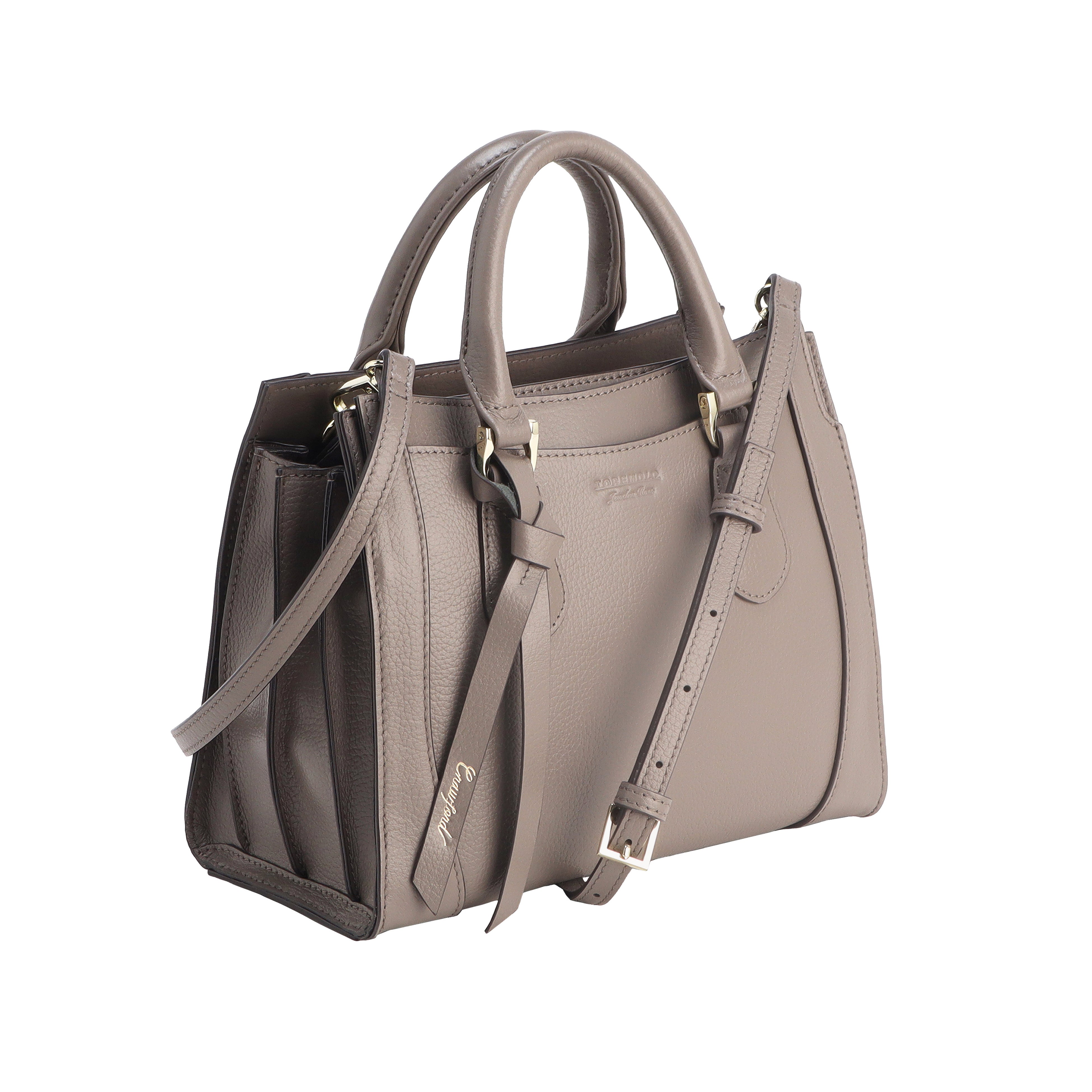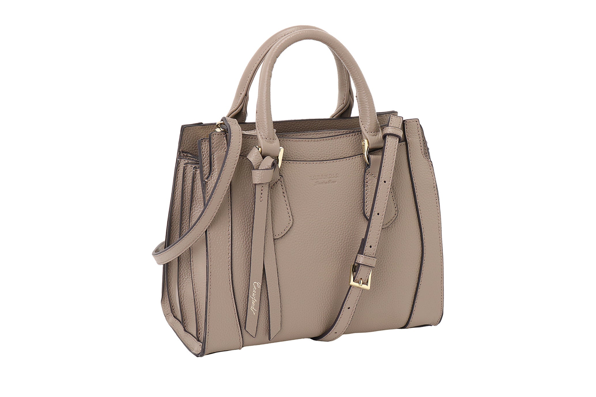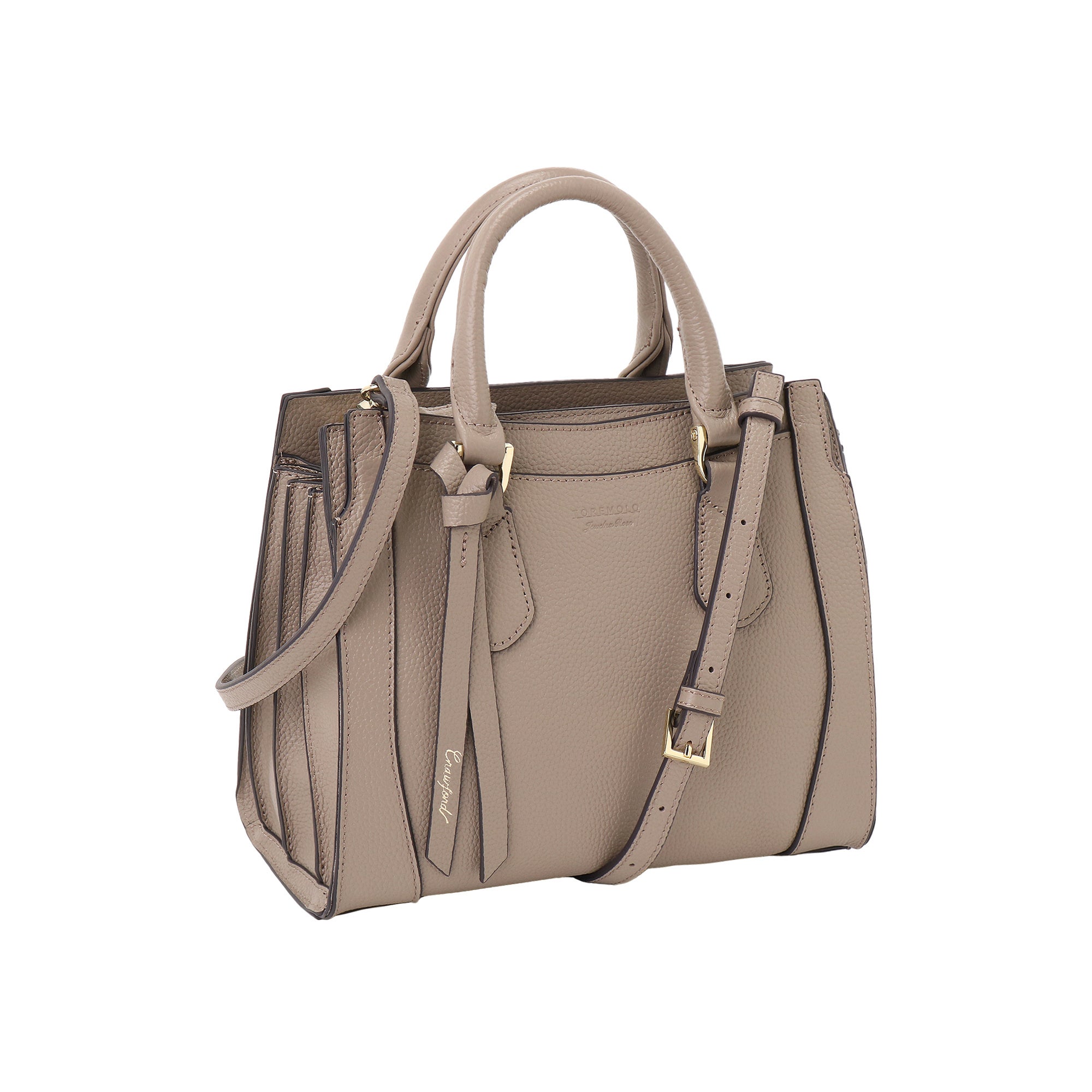 「クロフォード」は、傷が目立ちにくく、使い込むほどに風合いが増すシュリンクレザーを採用した、上品なお仕事バッグです。スクエアフォルムの本体に、ゴールドパーツと本革のリボンをあしらい、さりげない華やかさを添えています。