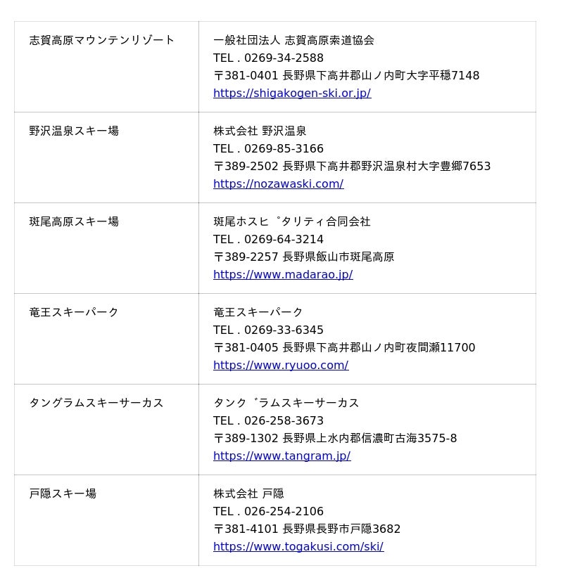 各スキー場のお問い合わせ先