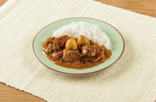 原材料名 鶏肉(豊橋産)、トマト(豊橋産)、グリル野菜ミックス(グリルズッキーニ加工品、グリルナス加工品、グリル黄ピーマン、グリル赤ピーマン)、キャベツ(豊橋産)、うずら卵(豊橋産)、たまねぎ、食用調合油、ポークエキス、フルーツチャツネ、チキンパウダー、カレー粉、食塩、しょうが、おろしにんにく、ガラムマサラ/増粘剤(加工でん粉、キサンタンガム)、調味料(アミノ酸等)、(一部に卵・鶏肉・バナナ・豚肉を含む)