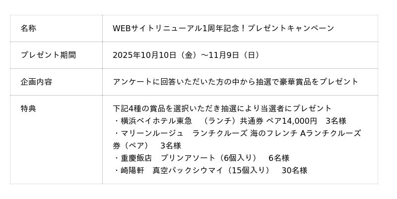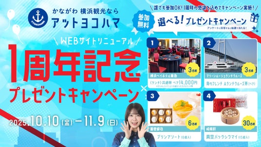 株式会社アットヨコハマ(本社:横浜市神奈川区栄町7-1/代表取締役:上野健彦・宮原漢二)※は、2024年10月のWEBサイトリニューアルオープンからおかげさまで1周年を迎えます。これを記念し日頃からの感謝の気持ちを込めて、「WEBサイトリニューアル1周年記念!プレゼントキャンペーン」を、2025年10月10日(金)~11月9日(日)まで開催いたします。