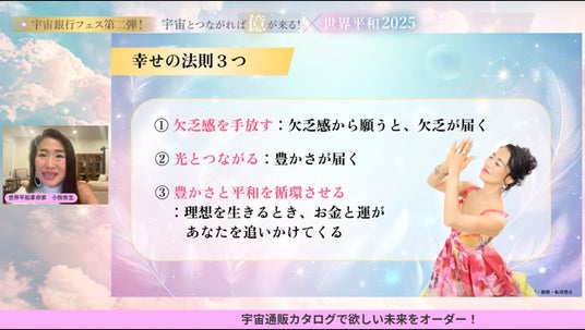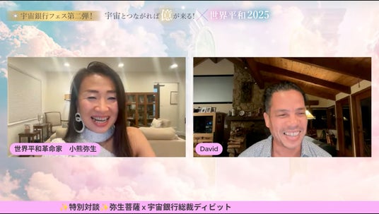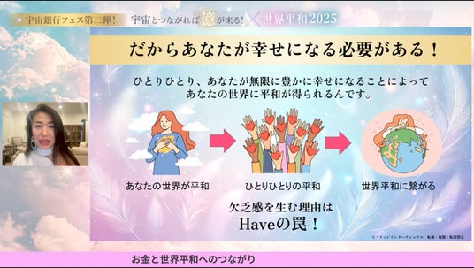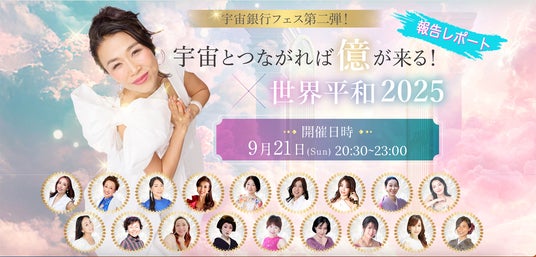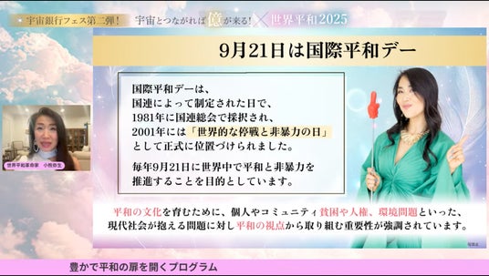 セミナーおよび各種講座の企画・開催、企業研修、コンサルティングなどを手掛ける株式会社ブリッジインターナショナル(本社:東京都港区、代表取締役・小熊弥生)は、2025年9月21日の「国際平和デー」にオンラインイベント「宇宙とつながれば億が来る!× 世界平和2025」を開催しました。 当日のライブは約2,000名が参加、動画再生回数は7,500回を超えました(9月28日現在)。