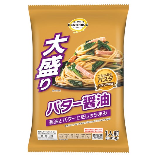 トップバリュベストプライス 大盛りバター醤油醤油とバターで味付けしたパスタです。バターのコクと、ベーコンのうまみをお楽しみいただけます。