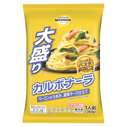 トップバリュベストプライス 大盛りカルボナーラ濃厚でクリーミーな、口どけのバランスが絶妙なソースが特徴のカルボナーラです。