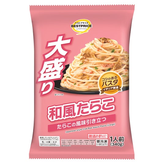 トップバリュベストプライス 大盛り和風たらこたらこの粒感とだしの風味たっぷりで、隠し味の昆布茶のうまみがひろがる和風パスタです。
