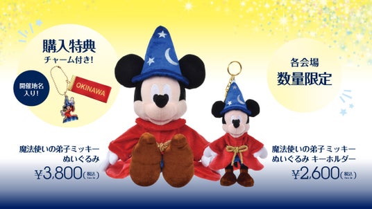 ご好評につき、ディズニーストアクラブ会員来店者限定グッズとして、「魔法使いの弟子」に扮したミッキーのぬいぐるみキーホルダーとぬいぐるみを発売します。購入特典の各開催地名入りチャームは、赤を基調とした新デザインで登場します。ご購入方法などの詳細は、ディズニー公式オンラインストアよりご確認ください。