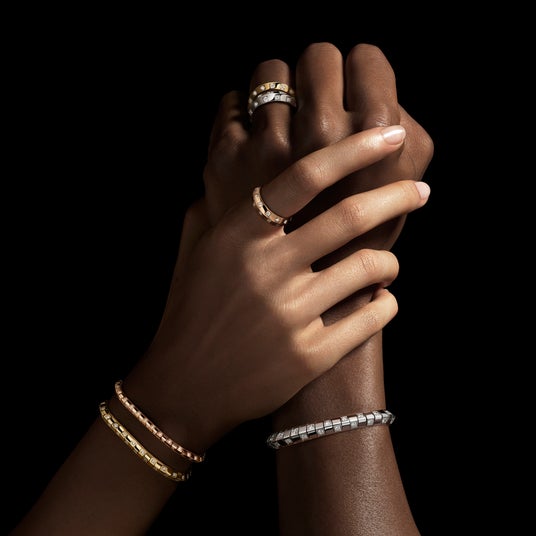 すべてのジュエリーが、ダミエ・モチーフを想起させ、艶のあるゴールド仕上げが柔らかな官能性を醸します。やや斜めになったスクエアの中に手仕事でセットされたラウンドダイヤモンドが目を引き、小さな爪で留める4本のグレインセッティングがアクセントを効かせます。デザインに独自のシャープな印象を与えるのは、本コレクションのシグネチャーである幾何学的なセンターライン。動きと連続性が一体化した究極のブレスレットとネックレスの構造は、ウォッチのブレスレットと同様の緻密な技術によるもの。それぞれのリンクは、手仕事でつなぎ合わされ、リンク同士の隙間を意図的に残すことで、よりなめらかに流れるようなフィット感が生まれます。卓越した技術の賜物であるクラスプも、美しくシームレスにデザインに溶け込みます。