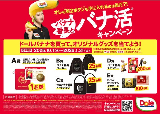 今回のプレゼントキャンペーンでは、「世界で一つだけの"バナナ番長の第2ボタン"」ほか、オリジナルのパーカーやトートバッグなど、ここでしか手に入らない「バナナ番長オリジナルグッズ」を多数ご用意しました。キャンペーン期間は2025年10月1日(水)~2026年1月31日(土)まで。期間中に対象のDoleバナナをご購入の上、WEBまたは郵送でご応募ください。