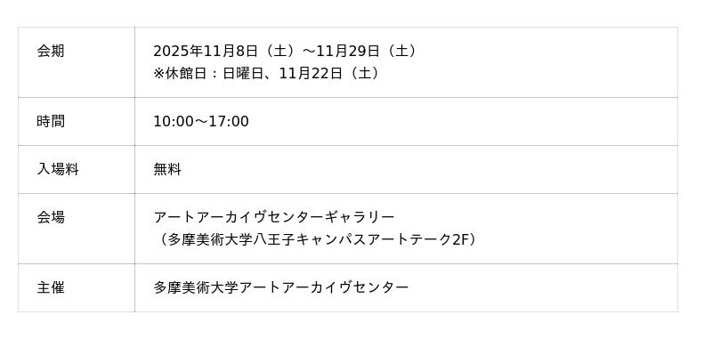 多摩美術大学アートアーカイヴセンター(AAC)は、多摩美術大学(東京都世田谷区、八王子市、学長:内藤廣)の附属施設で、現在、21の資料体を有し、アーカイヴの構築、公開、活用、研究を行っています。活動の成果は、シンポジウムや年報/紀要『軌跡』にて発信しています。また、AACの資料を活用した展覧会をアートアーカイヴセンターギャラリー(八王子キャンパス)にて定期的に開催しています。https://aac.tamabi.ac.jp/