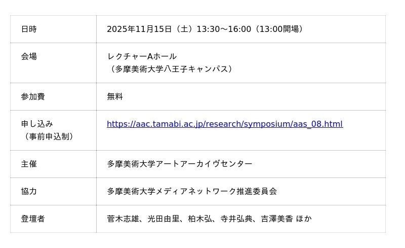 展覧会会期中の2025年11月15日(土)には、レクチャーAホールにて、第8回多摩美術大学アートアーカイヴシンポジウム「菅木志雄 これまでとこれから」を開催。菅による講演および本学在学生・教員との座談会、AAC所蔵資料の紹介などを予定。久しぶりに本学を訪れる菅が、作家としての「これまでとこれから」を語ります。