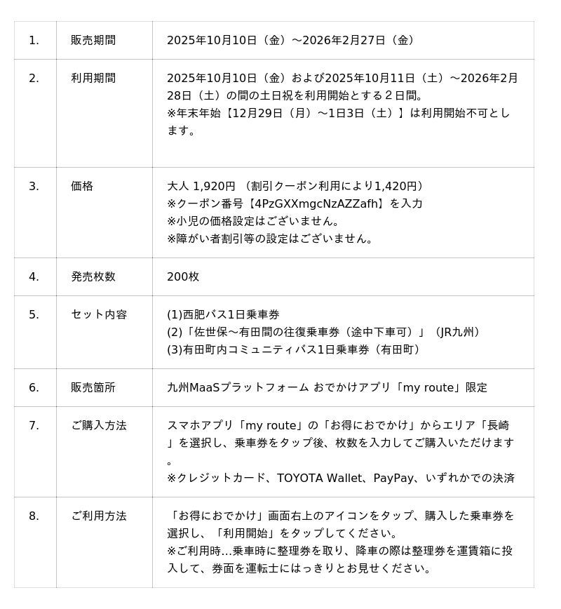 - 一般社団法人九州MaaS協議会会員である、西肥自動車株式会社(以下:西肥バス)、九州旅客鉄道株式会社(以下:JR九州)は、佐賀県有田町(以下:有田町)と共同で、佐世保市内および有田町内での観光をお得かつ快適に楽しめるデジタルきっぷを、2025年10月10日(金)佐世保市で開催される「マイナビ ツール・ド・九州2025佐世保クリテリウム」にあわせ、大会開催を地域一体で盛り上げる取組みの一環として、2025年10月10日(金)から2026年2月27日(金)までの間、「九州MaaS」のプラットフォームであるトヨタファイナンシャルサービス(株)が提供するおでかけアプリ「my route」内で販売いたします。